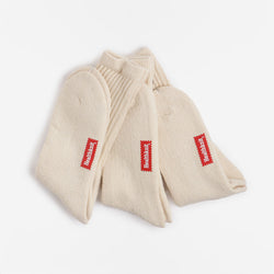The Healthknit 3 Pack Socks in Off White are an essential wardrobe staple offering the perfect blend of softness and durability. Made with a cotton-rich blend, these mid-length socks feature a reinforced sole and heel support for ultimate comfort, while keeping the design minimal with branding on the sole.
