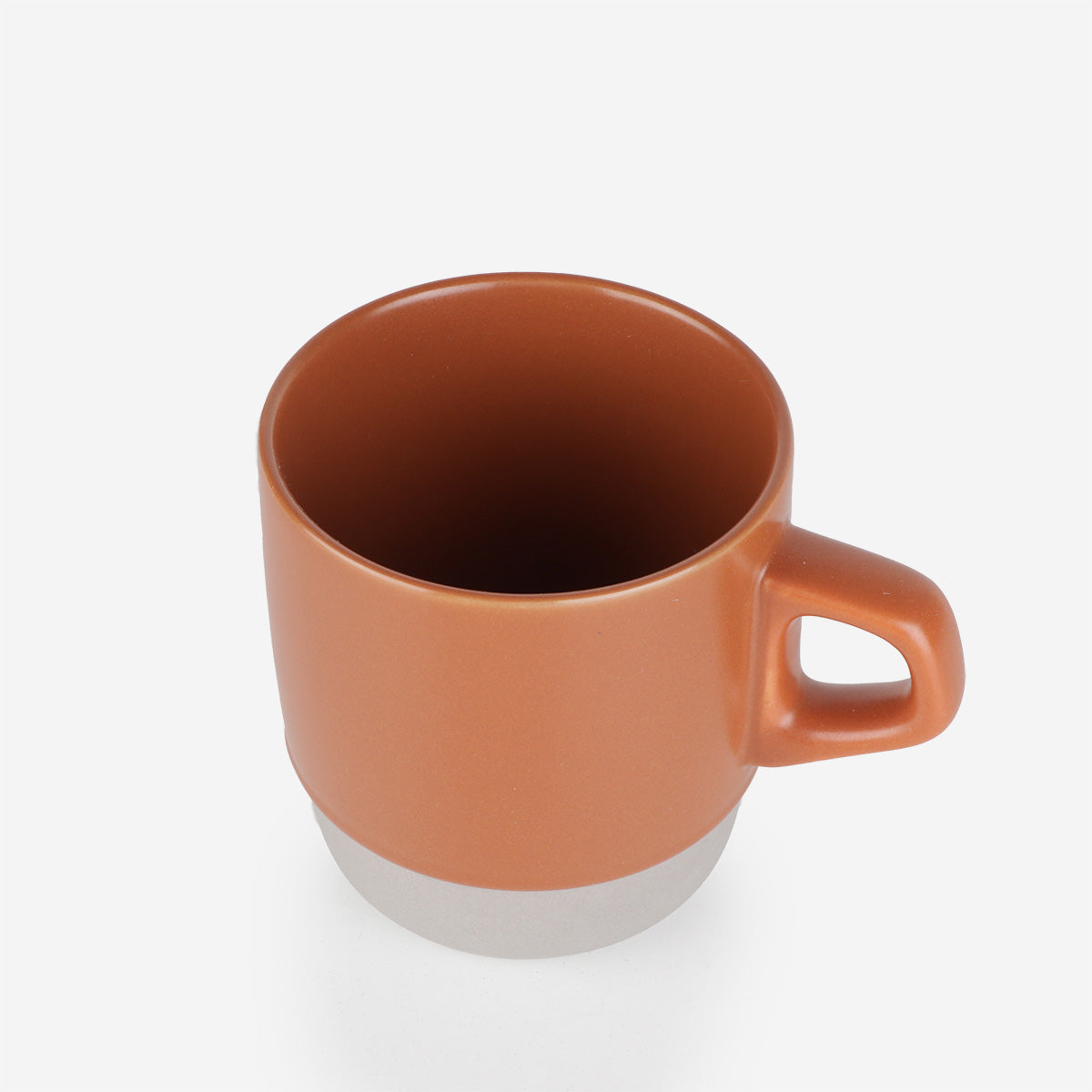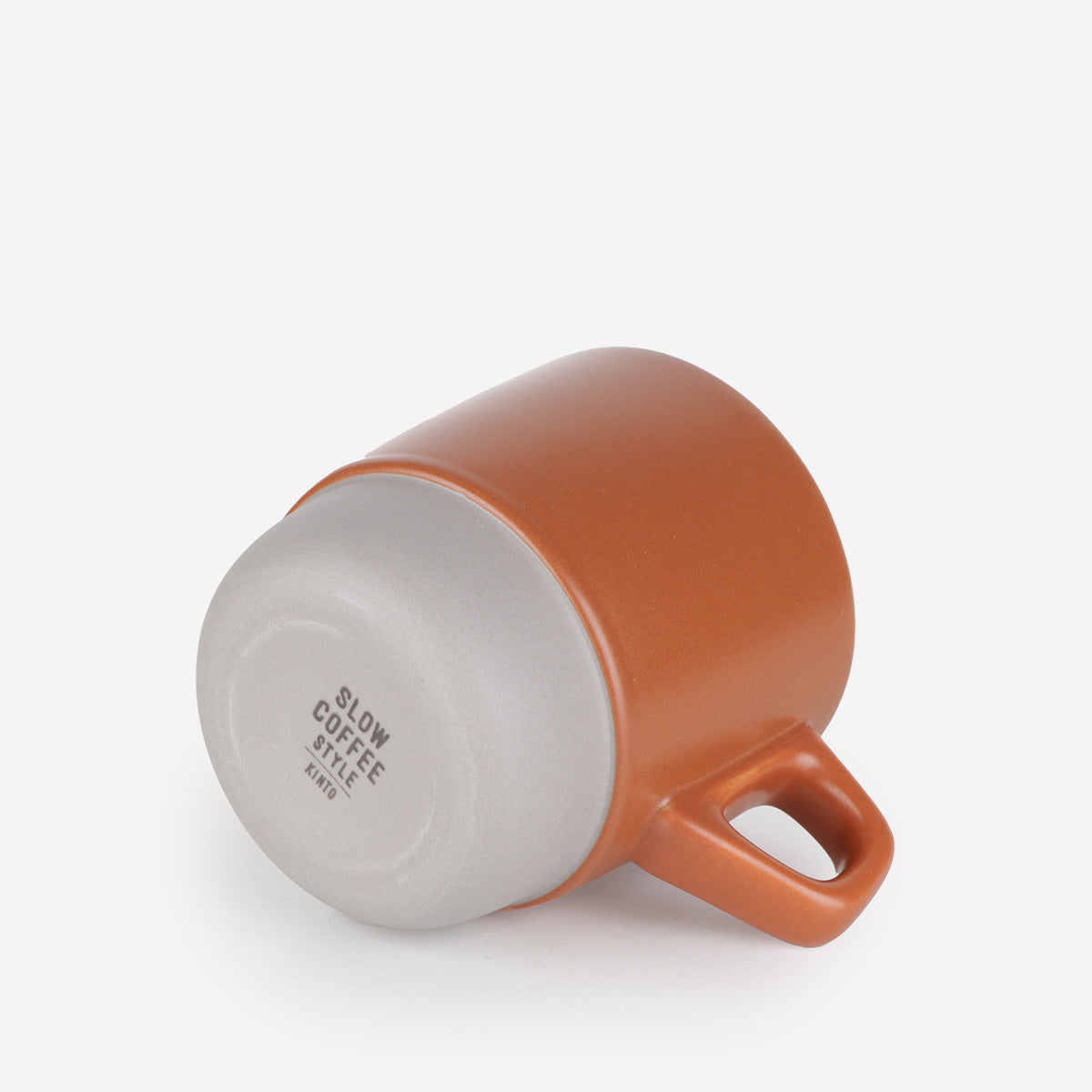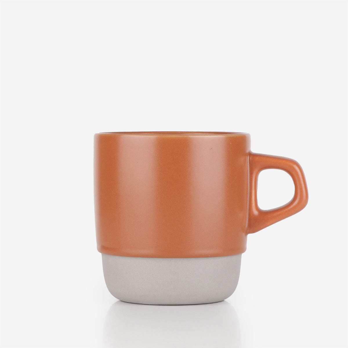 The Kinto SCS Stacking Mug in Orange shows the underlying clay beneath a matte textured glaze. Its distinctive "yo-hen" glazing technique results in varying colour and expressions for each mug adding to its unique charm.