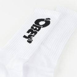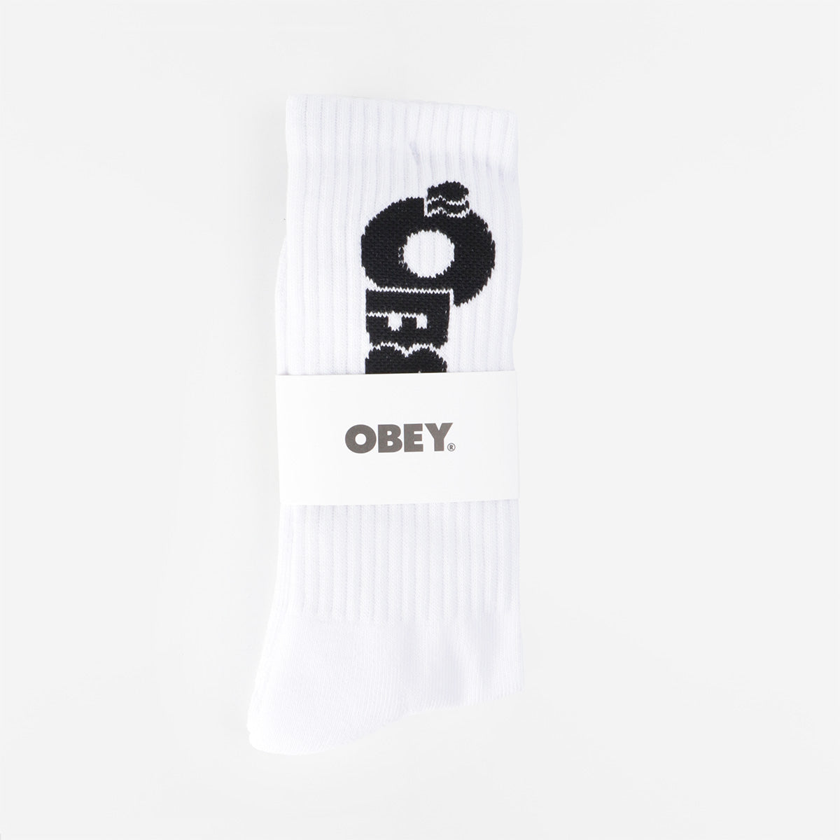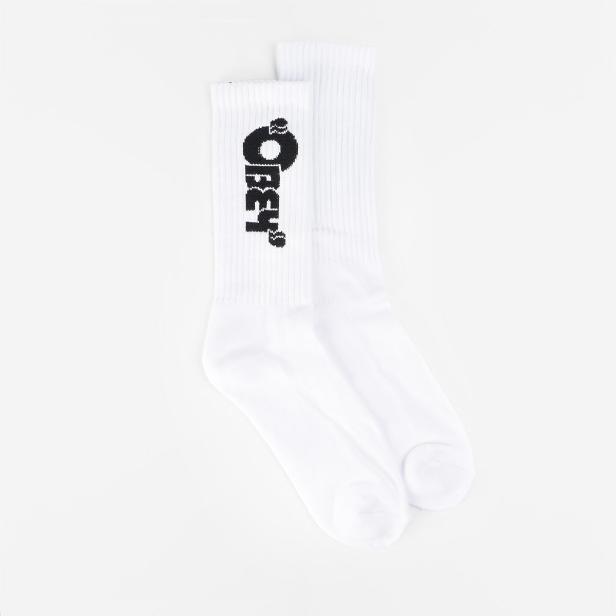 The OBEY Andy Socks are a classic white sock with a twist. Made with a high cotton blend for a soft and stretchy fit, these mid-length rib crew socks feature a bold intarsia OBEY art design above the ankle.
