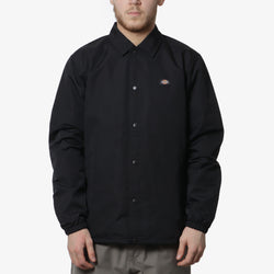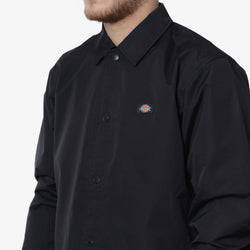 La veste Dickies Oakport en noir présente un style de veste d'entraîneur intemporel, arborant un col de chemise et un devant à boutons-pression pour un look classique.