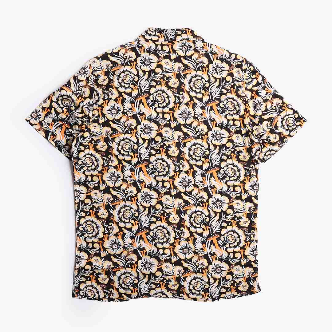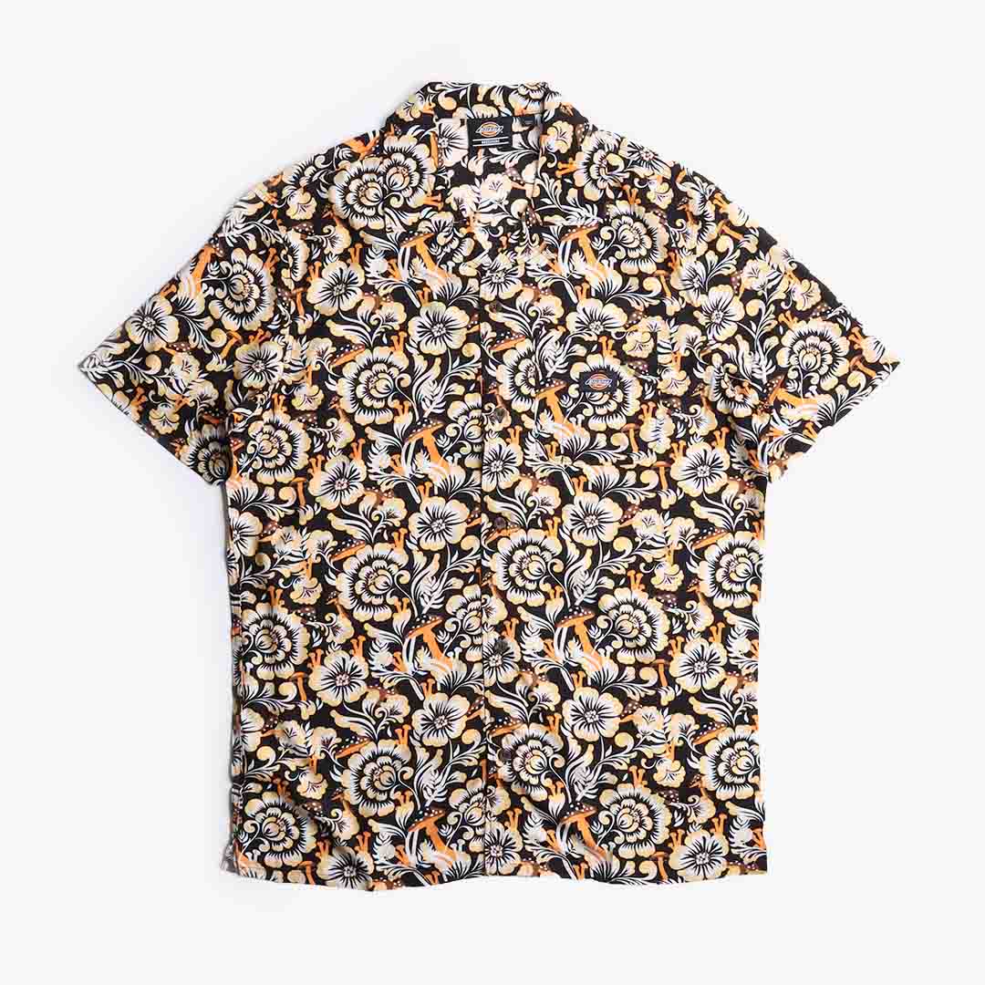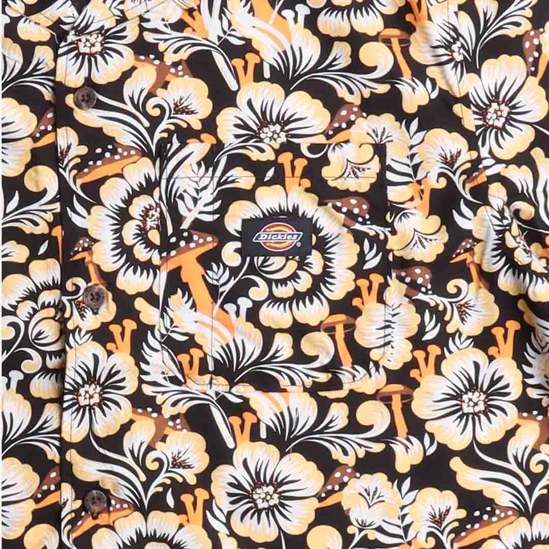 Crafted from 100% viscose, it has a unique all-over floral and fungi print and a relaxed fit with a V-shaped revere collar for a signature Dickies style.