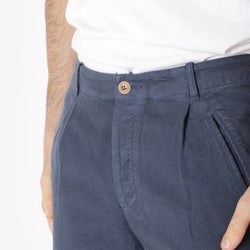 The front pleat detail, corozo nut button closure, and neatly bound internal cotton lining add refined details that elevate the design. Practical angled front pockets and welt back pockets complete this versatile style.