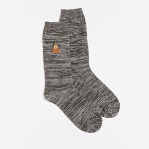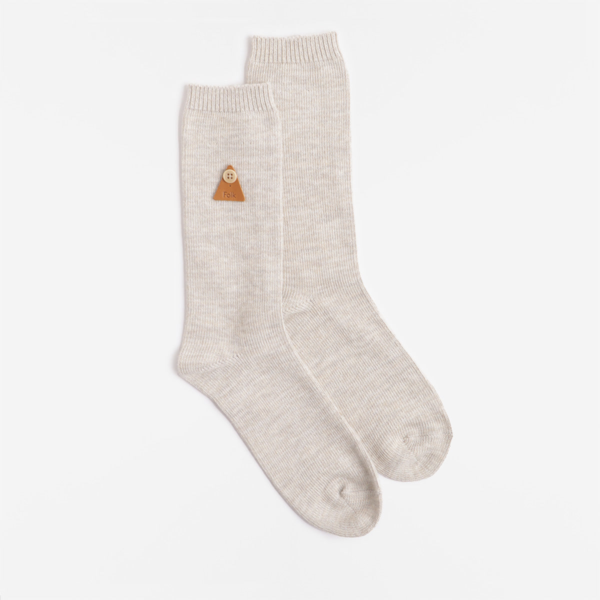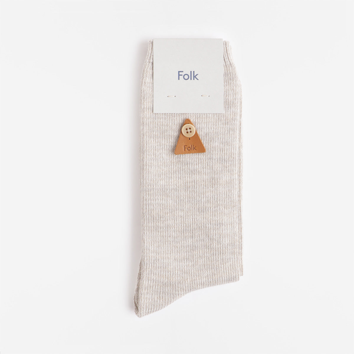 The Folk Melange Socks in Ecru Mix offer a classic design. Crafted from a blend of cotton, polyamide, and elastane, these socks feature a unique mix of yarns for a textured look. Ribbed cuffs provide a comfortable fit, finished with a corozo button detail.