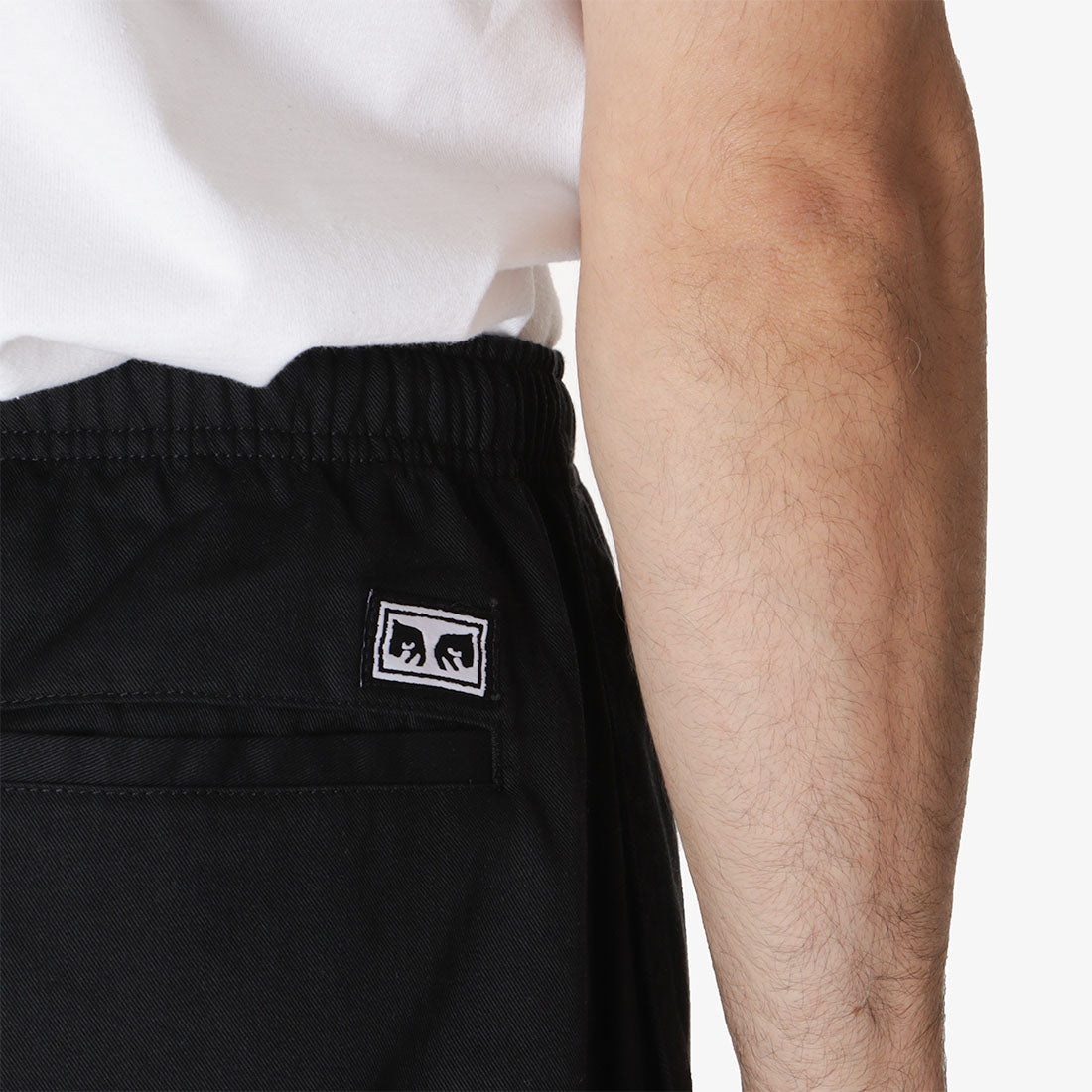 The OBEY Easy Twill Pant in Black offers comfort and effortless style–similar to sweatpants, but far more refined. Constructed with tough yet lightweight cotton twill, they boast a relaxed fit and tapered leg for a modern silhouette. The elastic waistband with a rounded drawstring provide a secure fit, while the front and back pockets and OBEY eyes label above the welt pocket complete the design.