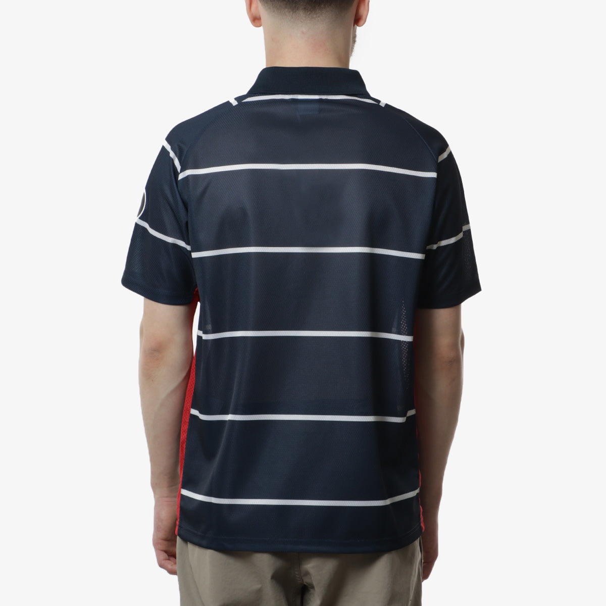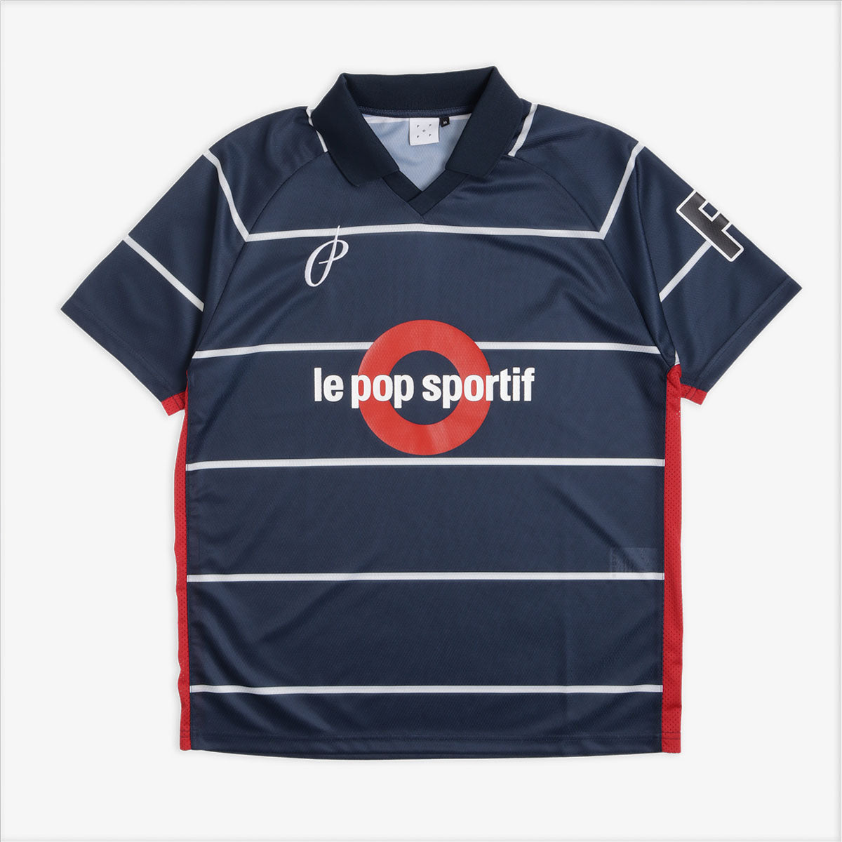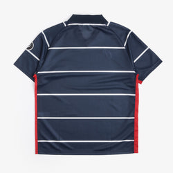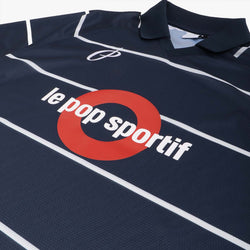 Make a statement with the Pop Trading Company Striped Sportif Shirt in Navy. Made from lightweight polyester mesh, this stylish piece features a bold stripe pattern and iconic plastisol pop sportif artwork on the chest and sleeve. The rib collar, v neckline with overlay, and raglan sleeves offer a comfortable and flattering fit.